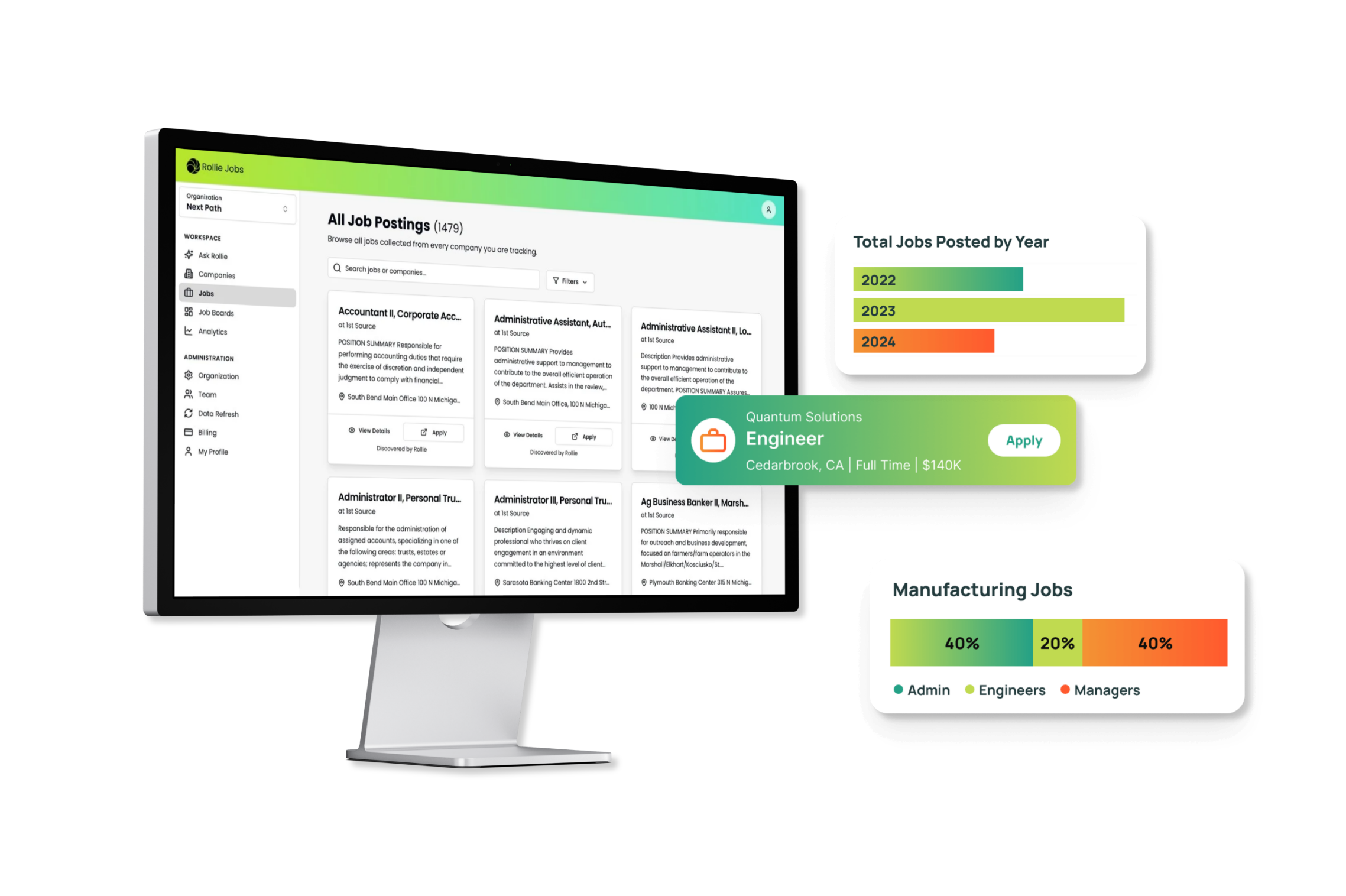Rollie transforms public job listings into clear, strategic data you can actually use. Whether you want to power a community job board, align workforce programs, or inform economic development, Rollie reveals what is really happening in your local job market automatically, every week.